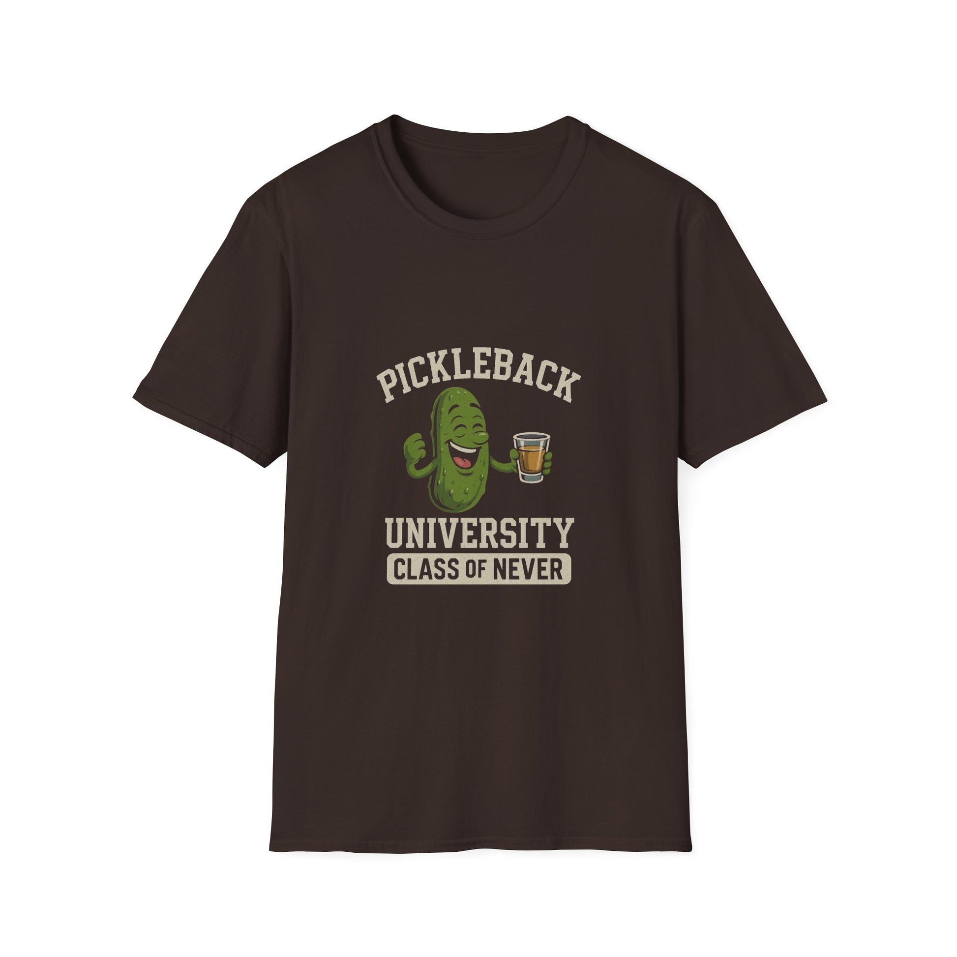 Pickleback University T-Shirt — “Class of Never” Funny Pickle & Shot Graphic Tee