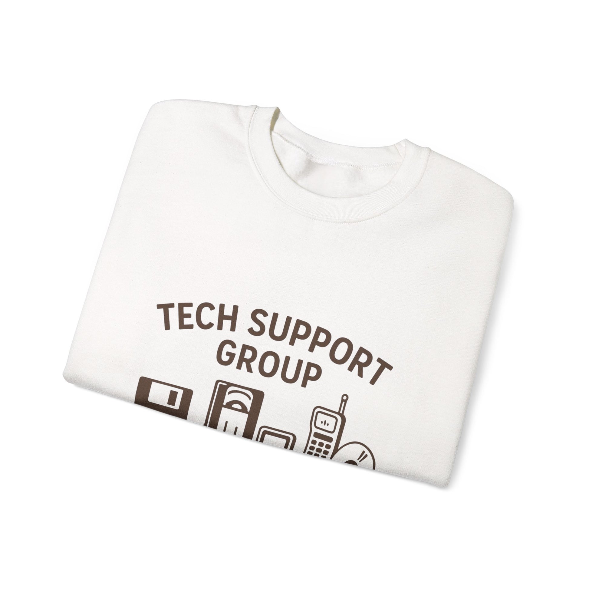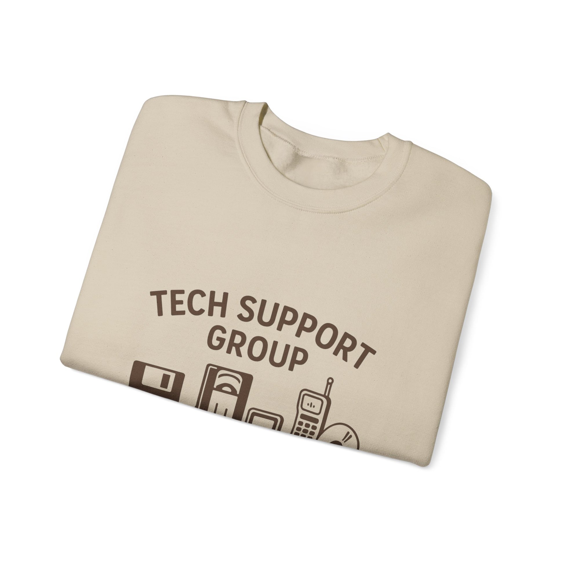 A soft, cozy crewneck sweatshirt that playfully celebrates the nostalgia of old gadgets. The front shows a charming lineup of retired tech — floppy disk, pager, brick phone, and dial-up modem — under the headline “TECH SUPPORT GROUP” and the small caption “We’re obsolete, not forgotten.” It feels like slipping into warm conversation with longtime coworkers or fellow tech lovers: familiar, funny, and quietly proud. The mid-weight cotton-poly blend holds shape and warmth while staying breathable. Subtle embroidery or printed neck labels add a handcrafted touch, making it feel cared-for rather than mass-produced. Wear it to low-key meetups, late-night coding sessions, or when you want to spark a laugh with colleagues who remember the old days.